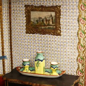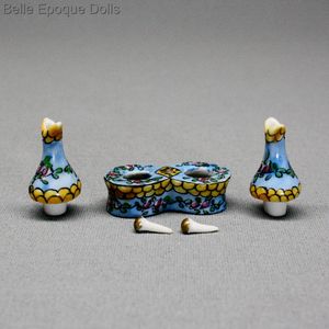 This classic coffee grinder made of pressed tin with painted brown finish to simulate rosewood is perfect for your kitchen. The top is made of brass and the tin crank handle really turns the gears to grind dolly's coffee !